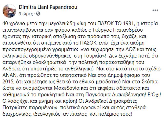 Δριμύ κατηγορώ κατά του Γιώργου Παπανδρέου, εξαπέλυσε η Δήμητρα Λιάνη Παπανδρέου μέσα από τον προσωπικό της λογαριασμό στο Facebook, κατηγορώντας τον πρώην πρόεδρο του ΠΑΣΟΚ ότι με τη στάση που τηρεί στην επικείμενη εκλογή Προέδρου στο ΚΙΝΑΛ διχάζει και αποσυνθέτει ό,τι απέμεινε από το ΠΑΣΟΚ.