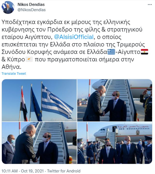 «Υποδέχτηκα εγκάρδια εκ μέρους της ελληνικής κυβέρνησης τον Πρόεδρο της φίλης και στρατηγικού εταίρου Αιγύπτου, Άμπντελ Φάταχ αλ Σίσι, ο οποίος επισκέπτεται την Ελλάδα στο πλαίσιο της Τριμερούς Συνόδου Κορυφής ανάμεσα σε Ελλάδα, Κύπρο και Αίγυπτο που πραγματοποιείται σήμερα στην Αθήνα».