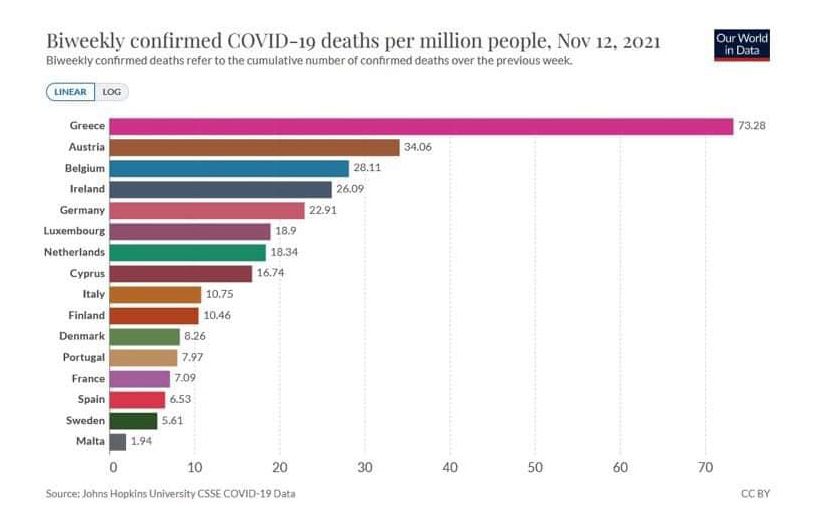 Σύμφωνα με τον Πίνακα του Πανεπιστημίου John Hopkins (12 Νοεμβρίου 2021) η Ελλάδα το τελευταίο 14ήμερα είχε την αρνητική πρωτιά με 73,28 θανάτους ανά εκατομμύριο και ακολουθεί η Αυστρία με λιγότερους από τους μισούς, δηλαδή, 34,06.