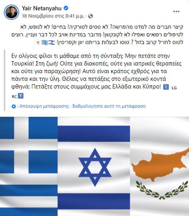 Ο γιος Νετανιάχου έχει επανειλημμένα επιτεθεί στην Τουρκία και ταχθεί ανοιχτά στο πλευρό των Ελλήνων.