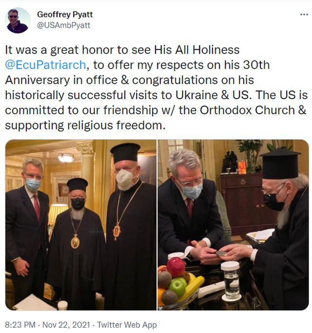 Σε μήνυμά του μέσω Twitter, ο Τζέφρι Πάιατ τονίζει πως οι ΗΠΑ δεσμεύονται στη φιλία τους με την Ορθόδοξη Εκκλησία και την υποστήριξη της θρησκευτικής ελευθερίας.