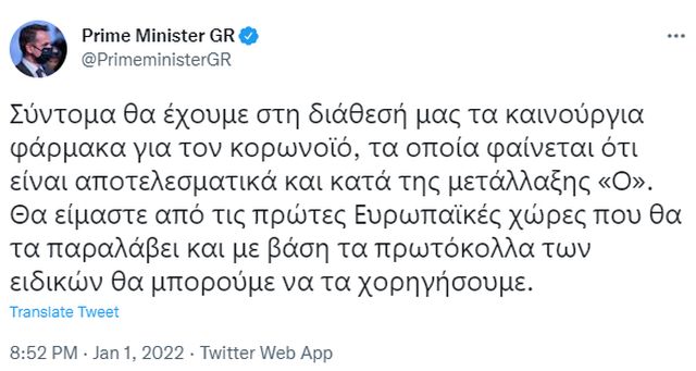 Το tweet του πρωθυπουργού, Κυριάκου Μητσοτάκη: