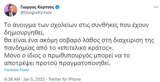 Σκληρή κριτική ασκεί για ακόμη μια φορά στις κυβερνητικές πολιτικές, ο ευρωβουλευτής της ΝΔ Γιώργος Κύρτσος και συγκεκριμένα για το επικείμενο άνοιγμα των σχολείων στις 10 Ιανουαρίου καθώς έκανε λόγο για ακόμα ένα «σοβαρό λάθος από το «επιτελικό κράτος».