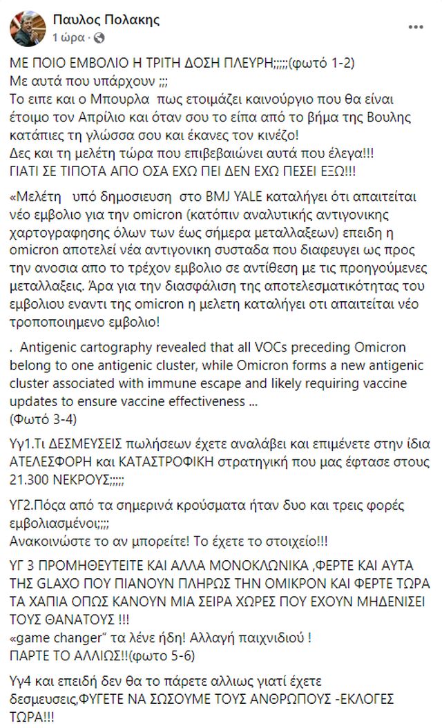 Ο Παύλος Πολάκης, με ανάρτησή του στο Facebook το βράδυ της Κυριακής, αναρωτιέται με ποιο εμβόλιο ζητείται από τους πολίτες να κάνουν την τρίτη δόση όταν, σύμφωνα με μελέτες αλλά και παραδοχή του ίδιου του Αλβέρτου Μπουρλά, το υπάρχον εμβόλιο δεν «πιάνει» την «Όμικρον» και ένα νέο εμβόλιο κατάλληλο για την «Όμικρον» δεν θα είναι έτοιμο πριν τον Απρίλιο.