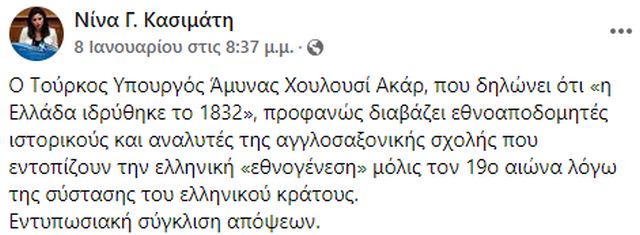 «Ο Τούρκος Υπουργός Άμυνας Χουλουσί Ακάρ, που δηλώνει ότι “η Ελλάδα ιδρύθηκε το 1832”, προφανώς διαβάζει εθνοαποδομητές ιστορικούς και αναλυτές της αγγλοσαξονικής σχολής που εντοπίζουν την ελληνική “εθνογένεση” μόλις τον 19ο αιώνα λόγω της σύστασης του ελληνικού κράτους.
