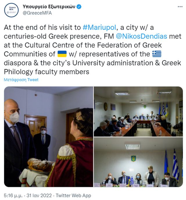 «Η ελληνική παρουσία στην ευρύτερη περιοχή της Μαύρης Θάλασσας έχει μακραίωνη ιστορία. Σήμερα στην Μαριούπολη, στα χωριά και κωμοπόλεις γύρω της, διαβιούν περίπου 120.000 ομογενείς», είπε ο Νίκος Δένδιας, σε συνέντευξή του στην εφημερίδα «Τα ΝΕΑ» το Σάββατο, αναφορικά με την ελληνική μειονότητα στην Ουκρανία και την πρόσφατη επίσκεψή του στη Μαριούπολη.
