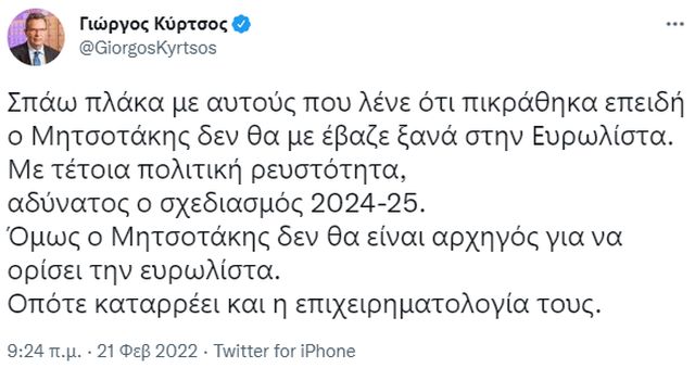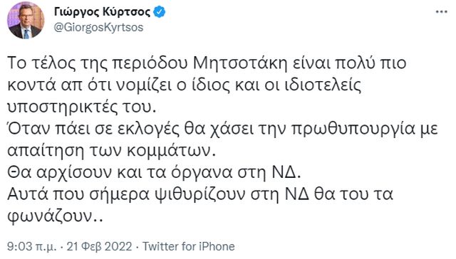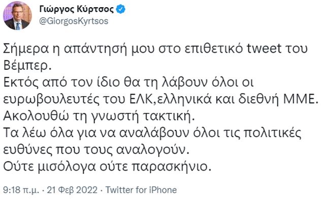 Με σειρά αναρτήσεών του στο Twitter ο μέχρι πρότινος γαλάζιος ευρωβουλευτής Γιώργος Κύρτσος αφενός μεν σημειώνει πως το τέλος της περιόδου του πρωθυπουργού Κυριάκου Μητσοτάκη είναι πιο κοντά απ’ ό,τι ο ίδιος «και οι ιδιοτελείς υποστηρικτές του» νομίζουν ενώ σημειώνει πως σήμερα θα απαντήσει «στο επιθετικό tweet του προέδρου του Ευρωπαϊκού Λαϊκού Κόμματος Μάνφρεντ Βέμπερ».