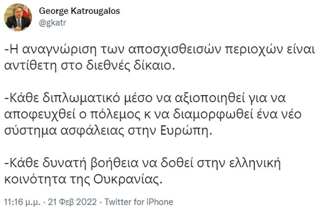 Ο βουλευτής του ΣΥΡΙΖΑ Προοδευτική Συμμαχία και πρώην υπουργός Εξωτερικών, με ανάρτησή του στο Twitter καταδίκασε την αναγνώριση των αποσχισθείσων περιοχών από τη Ρωσία και ζήτησε να δοθεί κάθε δυνατή βοήθεια στην ελληνική μειονότητα στην Ουκρανία: