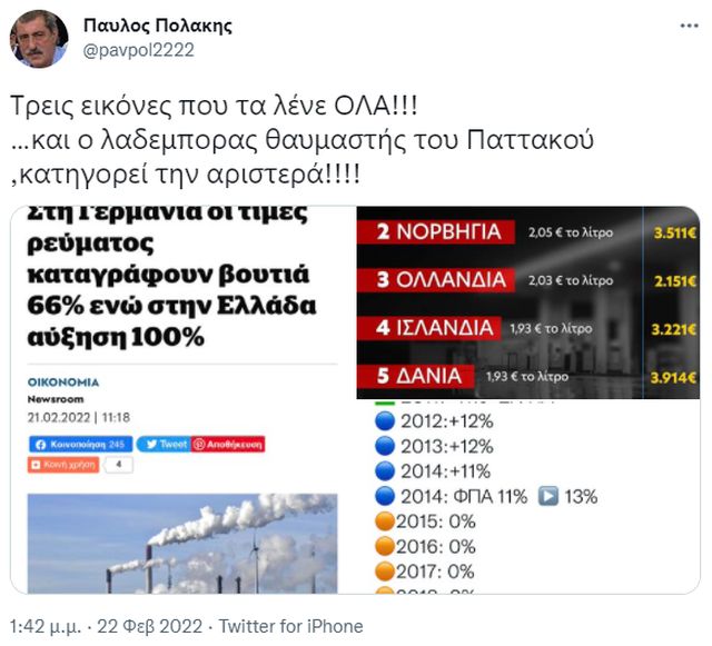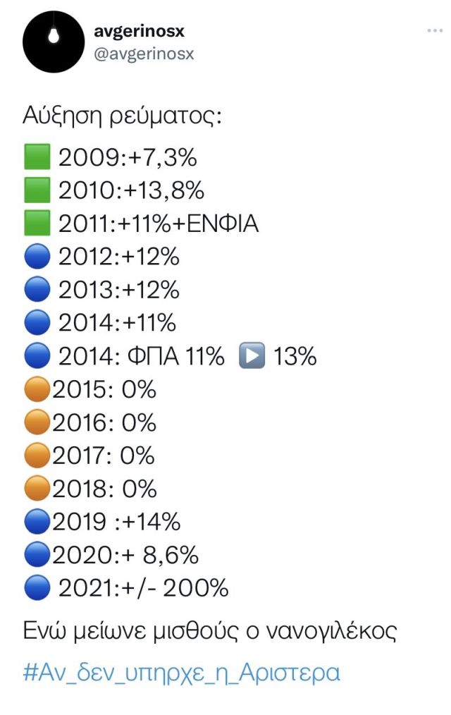 Σε ανάρτησή του κάνει αναφορά σε άρθρο για την άνοδο 100% της τιμής του ρεύματος στην Ελλάδα ενώ στη Γερμανία έπεσε κατά 66%, επίσης σε λίστα που αναφέρει τις τιμές της βενζίνης αλλά και το μέσο μισθό αλλά και στις αυξήσεις του ρεύματος στην Ελλάδα από το 2009.