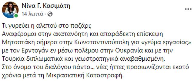 »Αναφέρομαι στην ακατανόητη και απαράδεκτη επίσκεψη Μητσοτάκη σήμερα στην Κωνσταντινούπολη για “γεύμα εργασίας” με τον Ερντογάν εν μέσω πολέμου στην Ουκρανία και με την Τουρκία διπλωματικά και γεωστρατηγικά αναβαθμισμένη.