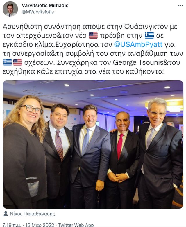 Διαβάστε σχετικά για Αμερικανική Πρεσβεία, Ηνωμένες Πολιτείες Αμερικής (ΗΠΑ), Μιλτιάδης Βαρβιτσιώτης, Ρόμπερτ Μενέντεζ, Τζέφρι Πάιατ, Τζορτζ Τζέιμς Τσούνης, Υπουργείο Εξωτερικών,
