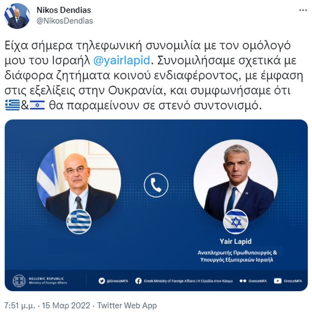 Τηλεφωνική συνομιλία με τον υπουργό Εξωτερικών του Ισραήλ, Γιαΐρ Λαπίντ, είχε την Τρίτη ο Νίκος Δένδιας. Ο επικεφαλής της ελληνικής διπλωματίας έγραψε στο Twitter:
