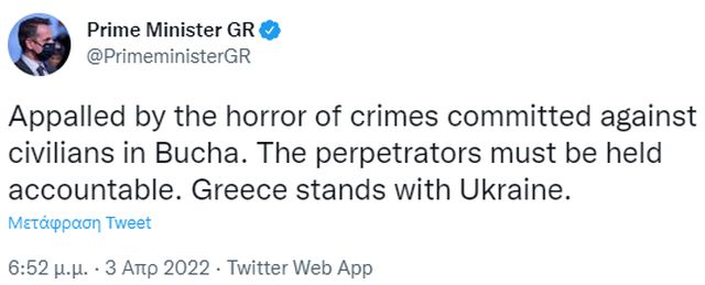Τον αποτροπιασμό του «για τη φρίκη των εγκλημάτων που διαπράχθηκαν κατά αμάχων στην πόλη Μπούκα», εκφράζει με ανάρτησή του στο Τwitter ο πρωθυπουργός Κυριάκος Μητσοτάκης.
