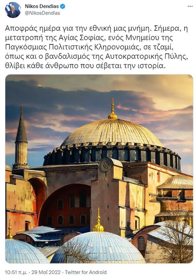 Λίγες ώρες μετά τις νέες εμπρηστικές δηλώσεις Ερντογάν, η Άγκυρα μέσω του υπουργείου Άμυνας αυτή τη φορά, «στόχευσε» τον Νίκο Δένδια και τον κατηγόρησε για επεκτατικές βλέψεις, με αφορμή την ανάρτησή του για την μαύρη επέτειο της άλωσης της Κωνσταντινούπολης και τον προκλητικό εορτασμό της από την Τουρκία.