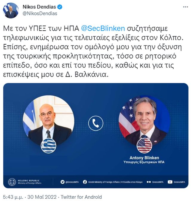 «Με τον ΥΠΕΞ των ΗΠΑ, Άντονι Μπλίνκεν, συζητήσαμε τηλεφωνικώς για τις τελευταίες εξελίξεις στον Κόλπο.