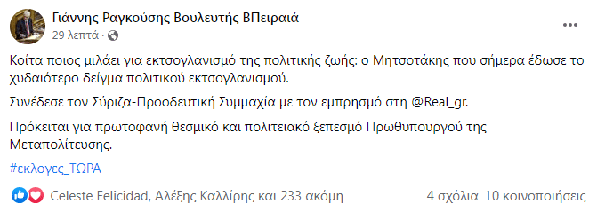 Σε ανάρτησή του στον προσωπικό του λογαριασμό στο Facebook, ο Γιάννης Ραγκούσης αναφέρει: