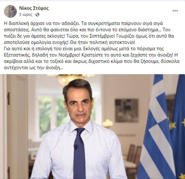 Ο πάντα καλά πληροφορημένος δημοσιογράφος Νίκος Στέφος εκτίμησε το πότε θα προκηρυχθούν πρόωρες εκλογές. Ο Νίκος Στέφος επισημαίνει ότι «η διαπλοκή» άρχισε να «αδειάζει» τον Κυριάκο Μητσοτάκη και τον πιέζει για άμεσες εκλογές. Ο δημοσιογράφος εκτιμά ότι μέχρι τις πρόωρες κάλπες θα ζήσουμε «τοξικό και άκρως διχαστικό κλίμα».