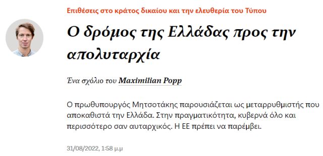 Ο Μαξιμίλιαν Ποπ, μέλος της αρχισυντακτικής ομάδας του μέσου, σε κείμενο-παρέμβαση του περιοδικού με τίτλο «Το μονοπάτι της Ελλάδας προς την απολυταρχία», εμμέσως πλην σαφώς γράφει ότι η κυβέρνηση βαδίζει στα μονοπάτια της Ουγγαρίας και της Πολωνίας, κατηγορεί τον Κυριάκο Μητσοτάκη ότι ενώ παρουσιάζεται σαν μεταρρυθμιστής που αναβαθμίζει την Ελλάδα, στην πραγματικότητα κυβερνά με αυξανόμενο αυταρχισμό, προσθέτοντας ότι η Ε.Ε. πρέπει να παρέμβει.