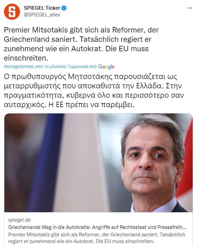 Με μια εξαιρετικά σκληρή τοποθέτηση το γερμανικό Spiegel εκθέτει πλήρως τον Κυριάκο Μητσοτάκη και την κυβέρνησή του, αναδεικνύει τις αντιδημοκρατικές πρακτικές του Μαξίμου, τις οποίες ανέχεται έως και χαιρετίζει η Ε.Ε. και καλεί τις Βρυξέλλες να παρέμβουν.