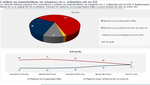 Στην ερώτηση αν για την παρακολούθηση του τηλεφώνου του Ν. Ανδρουλάκη γνώριζε ο πρωθυπουργός, 6 στου 10 Ελληνες (61%) λένε ότι πρόκειται για επιλογή που ήταν σε γνώση του Κυριάκου Μητσοτάκη.