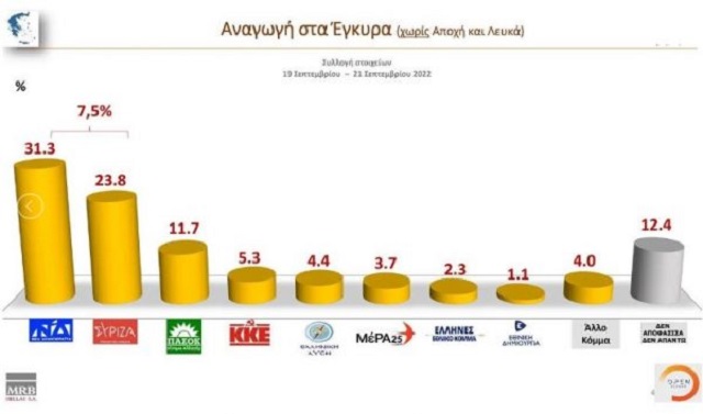 Στην πρόθεση ψήφου επί των εγκύρων (χωρίς την αποχή και τα λευκά) η Νέα Δημοκρατία συγκεντρώνει 31,3%, ο ΣΥΡΙΖΑ 23,8%, το ΠΑΣΟΚ 11,7%, το ΚΚΕ 5,3%, η Ελληνική Λύση 4,4%, το ΜέΡΑ 25 3,7%, οι Έλληνες για την Πατρίδα 2,3%, Εθνική Δημιουργία 1,1%, άλλο κόμμα 4%, αναποφάσιστοι 12,4%.