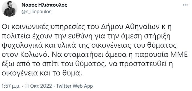 «Οι κοινωνικές υπηρεσίες του Δήμου Αθηναίων κ η πολιτεία έχουν την ευθύνη για την άμεση στήριξη ψυχολογικά και υλικά της οικογένειας του θύματος στον Κολωνό.