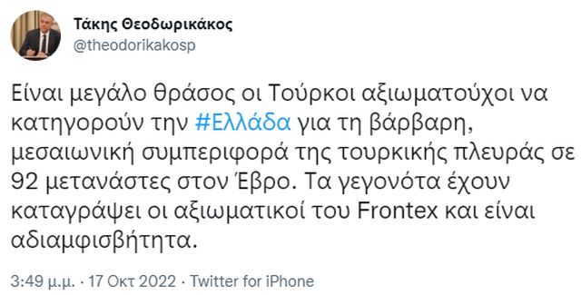 Στις προκλητικές δηλώσεις του Τούρκου υπουργού Εξωτερικών, Μεβλούτ Τσαβούσογλου, για την υπόθεση των 92 μεταναστών που βρέθηκαν γυμνοί στις ελληνικές όχθες του Έβρου, απάντησε ο υπουργός Προστασίας του Πολίτη, Τάκης Θεοδωρικάκος, με ανάρτησή του στα μέσα κοινωνικής δικτύωσης.