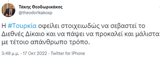 Πρόσθεσε, δε, ότι «η Τουρκία οφείλει στοιχειωδώς να σεβαστεί το Διεθνές Δίκαιο και να πάψει να προκαλεί και μάλιστα με τέτοιο απάνθρωπο τρόπο».