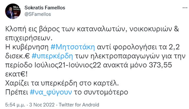 Να φύγει το συντομότερο η κυβέρνηση Μητσοτάκη γράφει σε ανάρτησή του στο Twitter ο Σωκράτης Φάμελλος. Ο πρώην υπουργός και βουλευτής του ΣΥΡΙΖΑ Προοδευτική Συμμαχία, καταγγέλλει «κλοπή εις βάρος των καταναλωτών» και ότι η κυβέρνηση χαρίζει τα κέρδη στο καρτέλ.