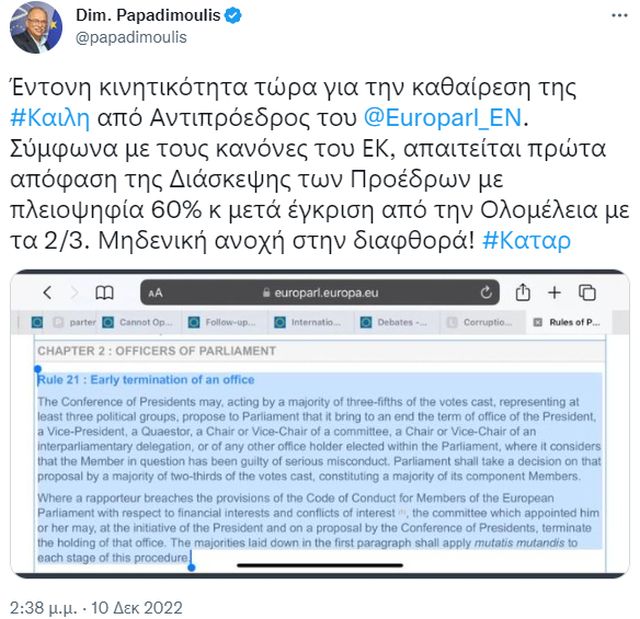 Κινήσεις για την για την καθαίρεση της Εύας Καϊλή από τη θέση της Αντιπροεδρίας του ευρωκοινοβουλίου παρατηρεί ο ευρωβουλευτής του ΣΥΡΙΖΑ Δημήτρης Παπαδημούλης.