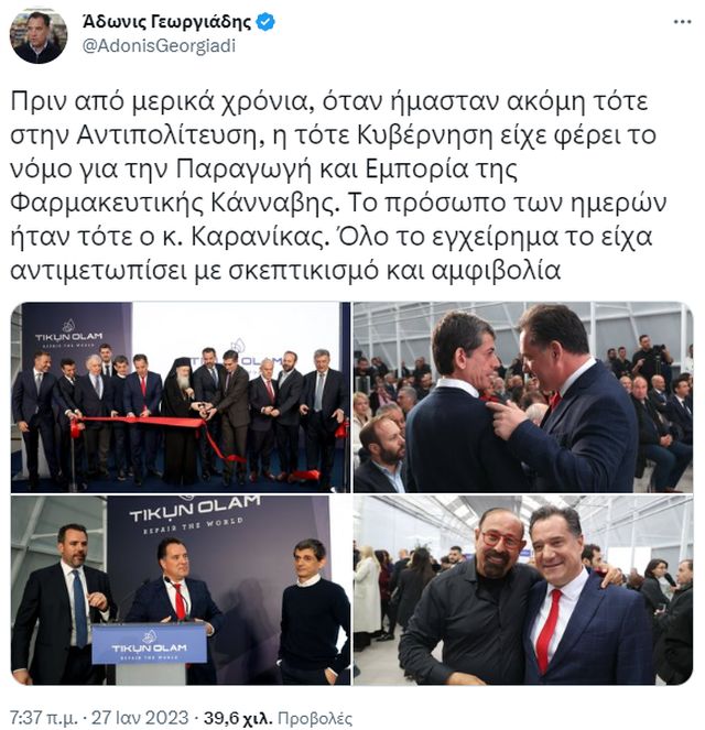 Το γεγονός ότι είχε λάθος αντίδραση στο ζήτημα της εισαγωγής της φαρμακευτικής κάνναβης στην Ελλάδα παραδέχθηκε ο υπουργός Ανάπτυξης Άδωνις Γεωργιάδης ο οποίος, χθες, κατά τα εγκαίνια της TIKUN OLAM Europe, της πρώτης μονάδας φαρμακευτικής κάνναβης στην Ελλάδα εκθείασε τον σύμβουλο του Αλέξη Τσίπρα, Νίκο Καρανίκα για τον ρόλο του στο θέμα.