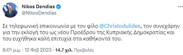 Συγκεκριμένα, όπως γνωστοποιεί ο ίδιος ο κ. Δένδιας σε ανάρτησή του σε μέσα κοινωνικής δικτύωσης, «σε τηλεφωνική επικοινωνία με τον φίλο Νίκο Χριστοδουλίδη, τον συνεχάρην για την εκλογή του ως νέου Προέδρου της Κυπριακής Δημοκρατίας και του ευχήθηκα καλή επιτυχία στα καθήκοντά του».