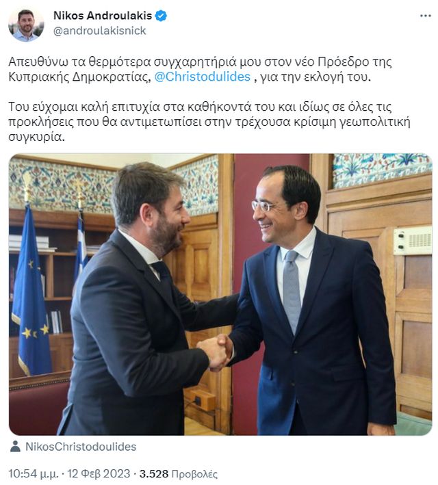 Συγχαρητήρια για την εκλογή του στην Προεδρία της Κυπριακής Δημοκρατίας, απηύθυνε στον Νίκο Χριστοδουλίδη, ο πρόεδρος του ΠΑΣΟΚ-ΚΙΝΑΛ, Νίκος Ανδρουλάκης.