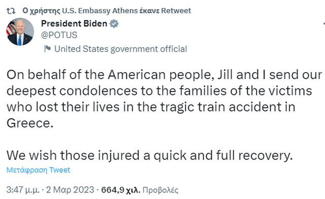 «Εκ μέρους του αμερικανικού λαού, η Τζιλ και εγώ στέλνουμε τα θερμά μας συλλυπητήρια στις οικογένειες των θυμάτων που έχασαν τη ζωή τους στο τραγικό σιδηροδρομικό δυστύχημα στην Ελλάδα».