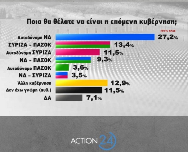 Ενφιαφέρον παρουσιάζει τα αποτελέσματα της ερώτησης «ποια θα θέλατε να είναι η επόμενη κυβέρνηση». Ειδικότερα, το 27,2% επιθυμεί κυβέρνηση με αυτοδύναμη τη ΝΔ, ενώ δεύτερη σε προτίμηση με ποσοστό 13,4% έρχεται η κυβέρνηση συνεργασία ΣΥΡΙΖΑ-ΠΑΣΟΚ.