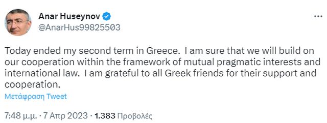 Πάντως, κατά τον ίδιο τον Χουσεΐνοφ (σ.σ. διορίστηκε πρέσβης του Αζερμπαϊτζάν στην Ελλάδα στις 27 Σεπτεμβρίου 2019), ο οποίος έκανε σχετική ανάρτηση στο Twitter, τελείωσε η δεύτερη θητεία του στην Ελλάδα: