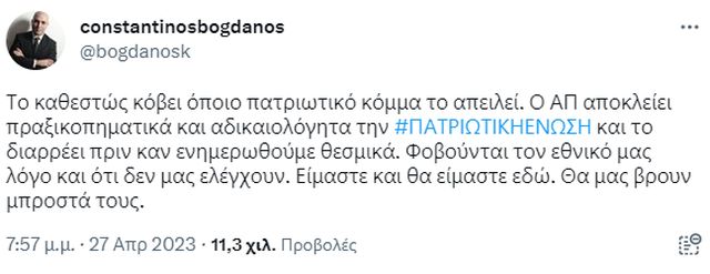 «Φοβούνται τον εθνικό μας λόγο και ότι δεν μας ελέγχουν» γράφει ο Κωνσταντίνος Μπογδάνος μετά τον αποκλεισμό του κόμματος του από τις εκλογές 2023 με απόφαση Αρείου Πάγου.