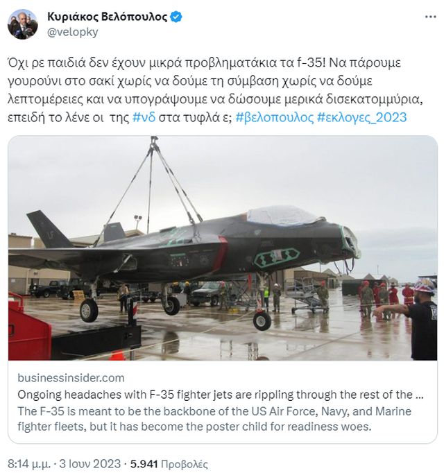 Ο κ. Βελόπουλος επανήλθε στο θέμα με ένα tweet, αναρωτώμενος εάν πρέπει να υπογράψουμε για τα F-35 χωρίς να δούμε τη σύμβαση.