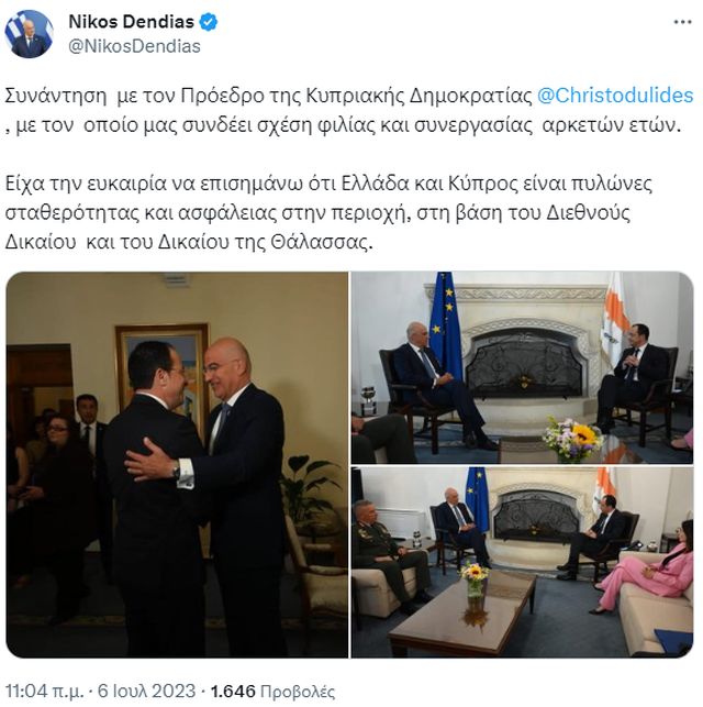 Καλωσορίζοντας τον κ. Δένδια, ο κ. Χριστοδουλίδης είπε ότι «είναι πάντα με ιδιαίτερη χαρά, φίλε Νίκο, που σε συναντώ, όπως και τώρα που σε καλωσορίζω στην Κύπρο υπό τη νέα σου ιδιότητα.
