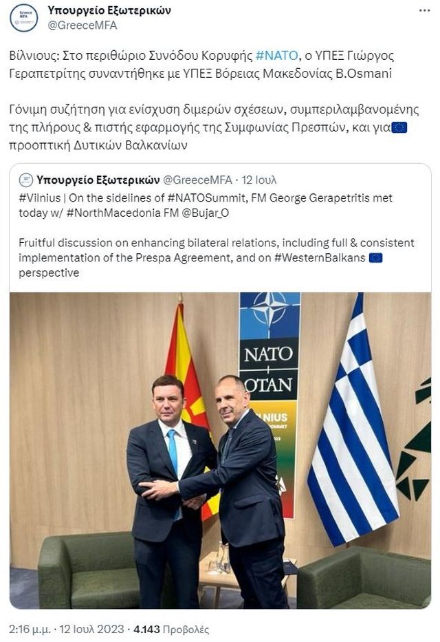 Ο υπουργός Εξωτερικών Γιώργος Γεραπετρίτης, ο οποίος συνόδευε τον Πρωθυπουργό στην Σύνοδο Κορυφής του ΝΑΤΟ στο Βίλνιους, είχε στο περιθώριο της Συνόδου σειρά επαφών με ομολόγους του.