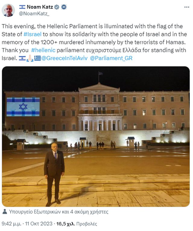 Ο εξαιρετικός πρεσβευτής του Ισραήλ στην Αθήνα, Νόαμ Κατς, για να ανταποδώσει την υποστήριξη της πατρίδας μας και να εκφράσει τις ευχαριστίες του, φωτογραφήθηκε μπροστά στην ελληνική Βουλή και σε ανάρτησή του στο «Χ», πρώην Twitter, έγραψε: