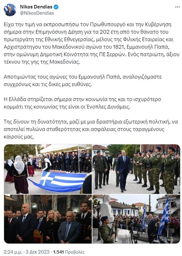 Ο υπουργός Εθνικής Άμυνας, Νίκος Δένδιας, εκπροσώπησε τον Πρωθυπουργό και την Κυβέρνηση την Κυριακή 3 Δεκεμβρίου 2023, στην Επιμνημόσυνη Δέηση για τα 202 έτη από τον θάνατο του Ήρωα Αρχιστράτηγου των Μακεδονικών Δυνάμεων της Ελληνικής Επανάστασης του 1821, Εμμανουήλ Παπά, στον Ιερό Ναό Αγίου Αθανασίου της Δημοτικής Κοινότητας Εμμανουήλ Παπά, του ομώνυμου Δήμου της Περιφερειακής Ενότητας Σερρών.