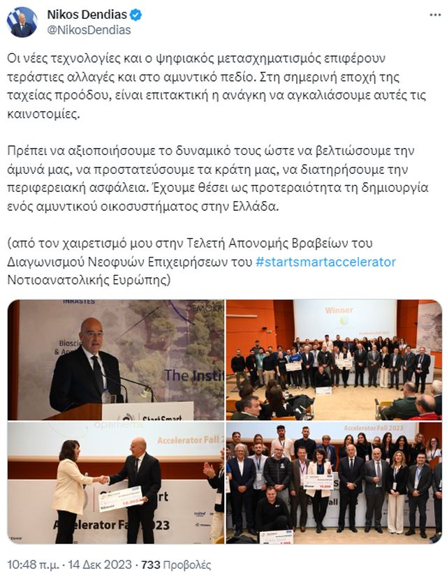 Αυτό τόνισε ο υπουργός Εθνικής Άμυνας, Νίκος Δένδιας, σε χαιρετισμό του, χθες, στην τελετή απονομής βραβείων του Ετήσιου Διαγωνισμού Νεοφυών Επιχειρήσεων του προγράμματος MIT StartSmart Accelerator Νοτιοανατολικής Ευρώπης.