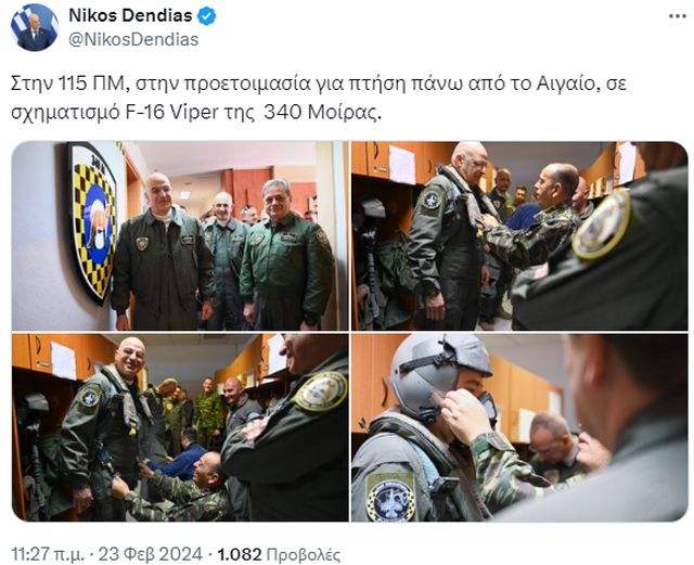 «Στην 115 ΠΜ, στην προετοιμασία για πτήση πάνω από το Αιγαίο, σε σχηματισμό F-16 Viper της 340 Μοίρας», έγραψε ο Νίκος Δένδιας στο «Χ» (πρώην Twitter).