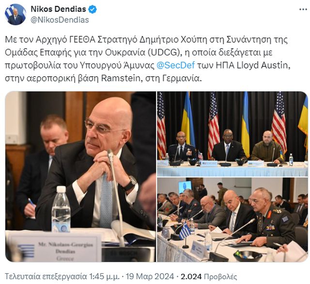Ο υπουργός Εθνικής Άμυνας, Νίκος Δένδιας, συμμετείχε την Τρίτη 19 Μαρτίου 2024 στην Συνάντηση της Ομάδας Επαφής για την Άμυνα στην Ουκρανία, στην αεροπορική βάση Ramstein στη Γερμανία.