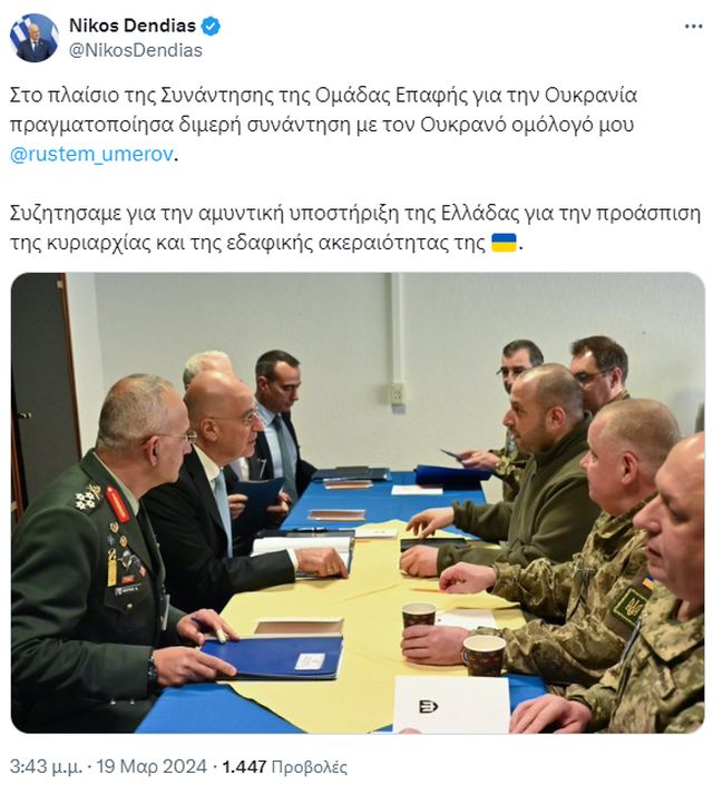 «Κατά την παρέμβασή μου στη Συνάντηση της Ομάδας Επαφής για την Άμυνα της Ουκρανίας, στο Ramstein, υπογράμμισα ότι αποτελεί θέση αρχής της Ελλάδας η στήριξη της Ουκρανίας και του δικαιώματός της να υπερασπιστεί την κυριαρχία και την εδαφική ακεραιότητά της, βάσει των αρχών του Διεθνούς Δικαίου και του Καταστατικού Χάρτη των Ηνωμένων Εθνών.