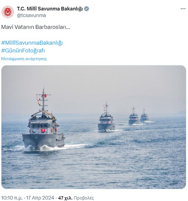 Παραθέτοντας μια φωτογραφία με πολεμικά σκάφη, το τουρκικό υπουργείο Άμυνας αναφέρει χαρακτηριστικά, σύμφωνα με τον ανταποκριτή του ΣΚΑΪ στην Κωνσταντινούπολη, Μανώλη Κωστίδη: «Οι Μπαρμπαρόσα της Γαλάζιας Πατρίδας».