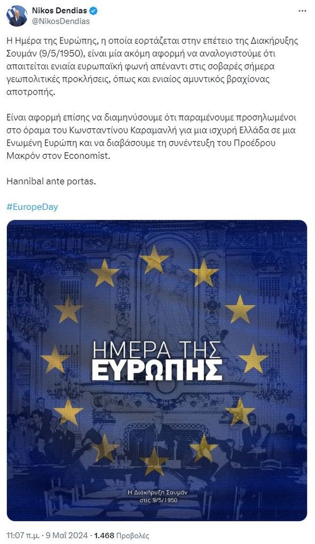 Όπως αναφέρει σε ανάρτησή του στα μέσα κοινωνικής δικτύωσης «Η Ημέρα της Ευρώπης η οποία εορτάζεται στην επέτειο της Διακήρυξης Σουμάν (9/5/1950), είναι μία ακόμη αφορμή να αναλογιστούμε ότι απαιτείται ενιαία ευρωπαϊκή φωνή απέναντι στις σοβαρές σήμερα γεωπολιτικές προκλήσεις, όπως και ενιαίος αμυντικός βραχίονας αποτροπής».