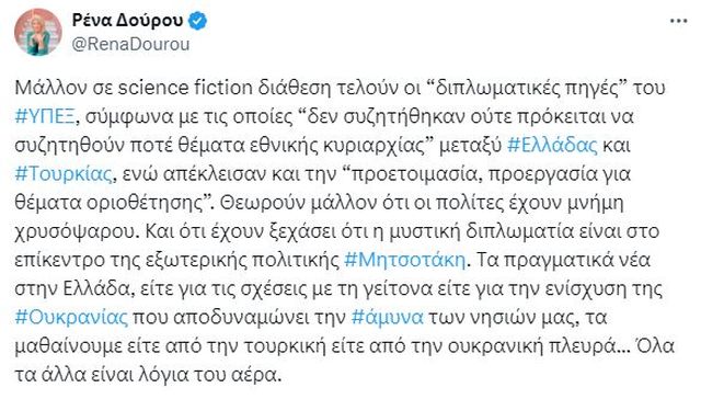 «Μάλλον σε science fiction διάθεση τελούν οι “διπλωματικές πηγές” του #ΥΠΕΞ, σύμφωνα με τις οποίες “δεν συζητήθηκαν ούτε πρόκειται να συζητηθούν ποτέ θέματα εθνικής κυριαρχίας” μεταξύ Ελλάδας και Τουρκίας, ενώ απέκλεισαν και την “προετοιμασία, προεργασία για θέματα οριοθέτησης”.