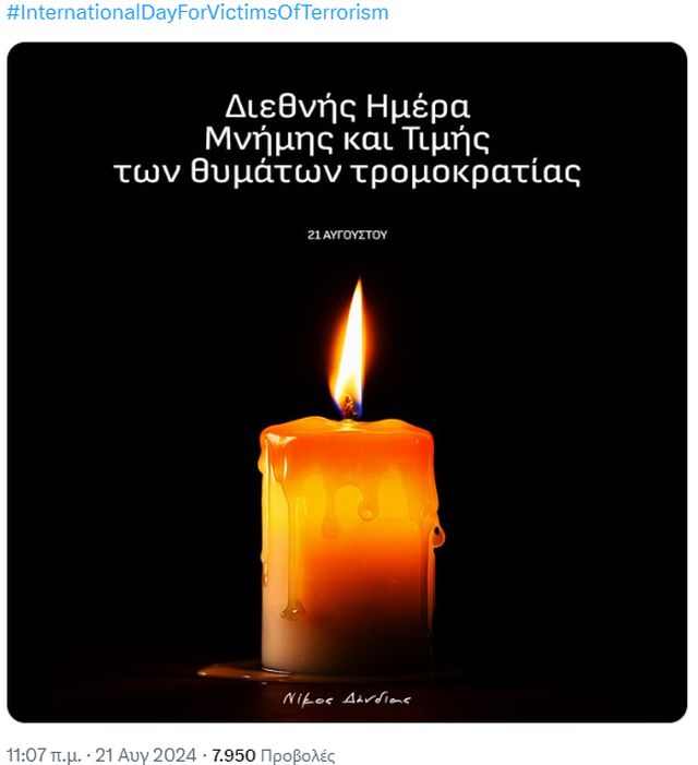 Αυτό έγραψε στον προσωπικό λογαριασμό του στο «Χ» ο υπουργός Εθνικής Άμυνας Νίκος Δένδιας, με την ευκαιρία της σημερινής Διεθνούς Ημέρας Μνημης και Τιμής των θυμάτων τρομοκρατίας.